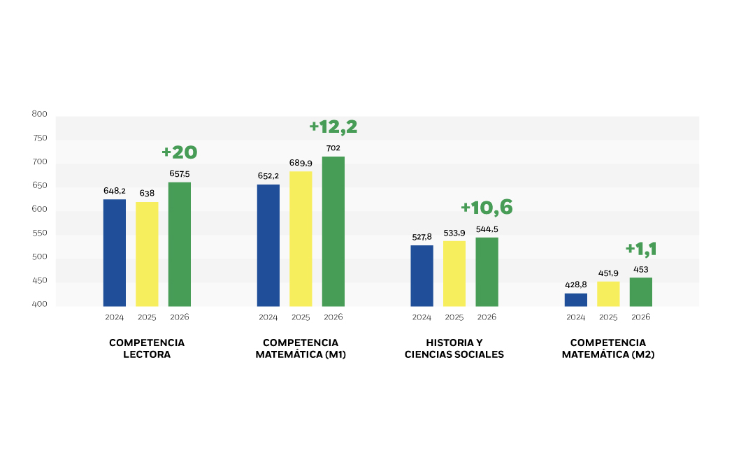 En comparación con el año anterior, observamos alzas en Competencia Lectora (+20 puntos), Matemática 1 (+12,2 puntos) e Historia y Ciencias Sociales (+10,6 puntos). Además, Matemática 2 presenta una leve mejora (+1,1 puntos). Junto con estos avances, se registra un descenso en Ciencias (−43,2 puntos), que asumimos como un desafío concreto y prioritario para fortalecer estrategias y apoyos en esa área.